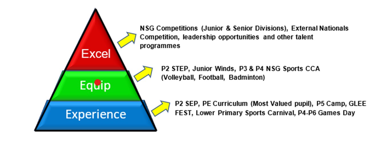 SPACE is a whole school approach to character building through sports. This is anchored in the beliefs that developing a passion for sports is an important component in the holistic development of pupils, and that sportsmen need to possess sound values and character. Through a 3E approach, various sports module are implemented for all pupils